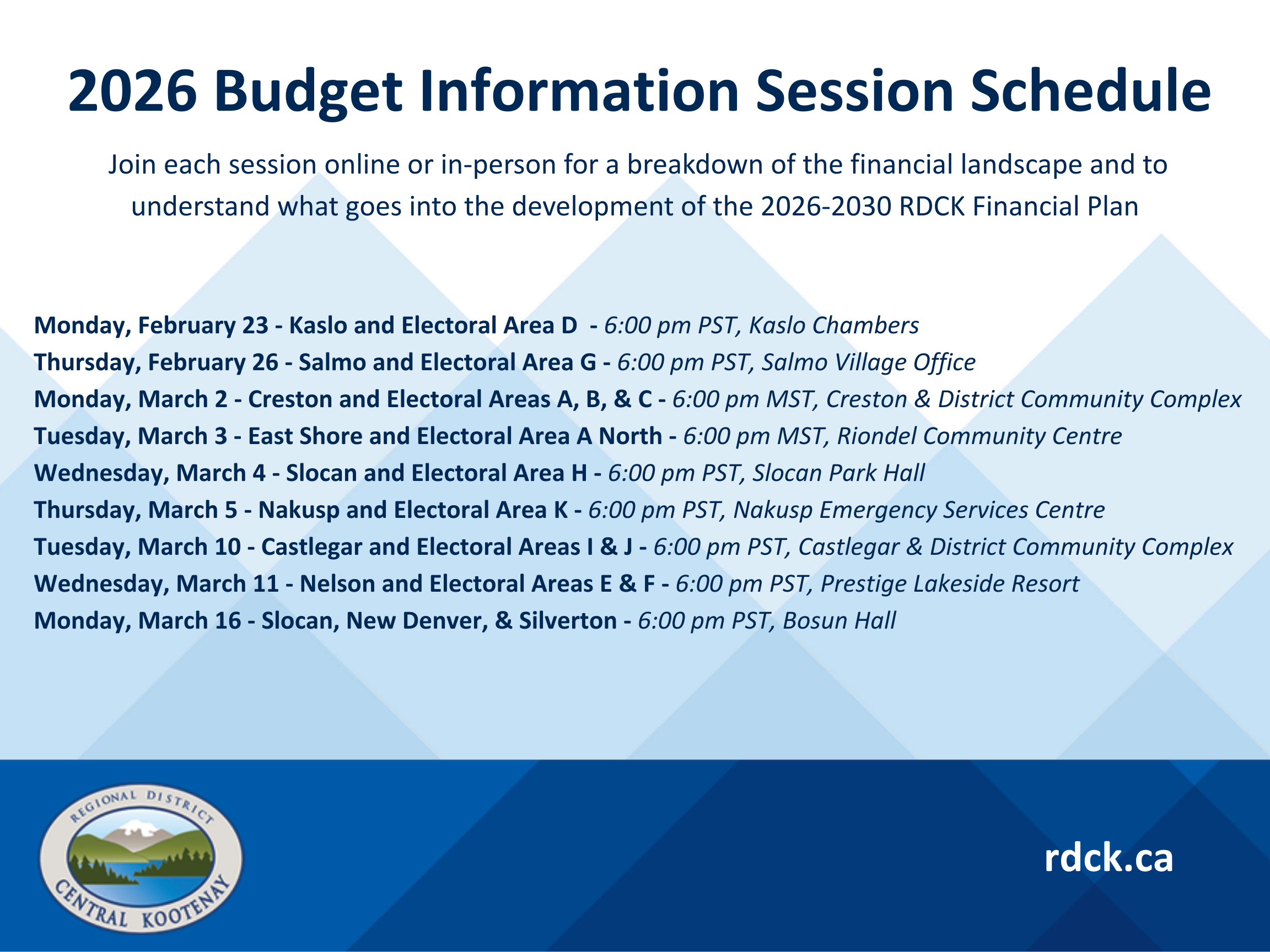 For information on how to join each session online, go to the specific event in our meetings calendar. Click here for the RDCK meetings page. Zoom information will be provided closer to each public information session.