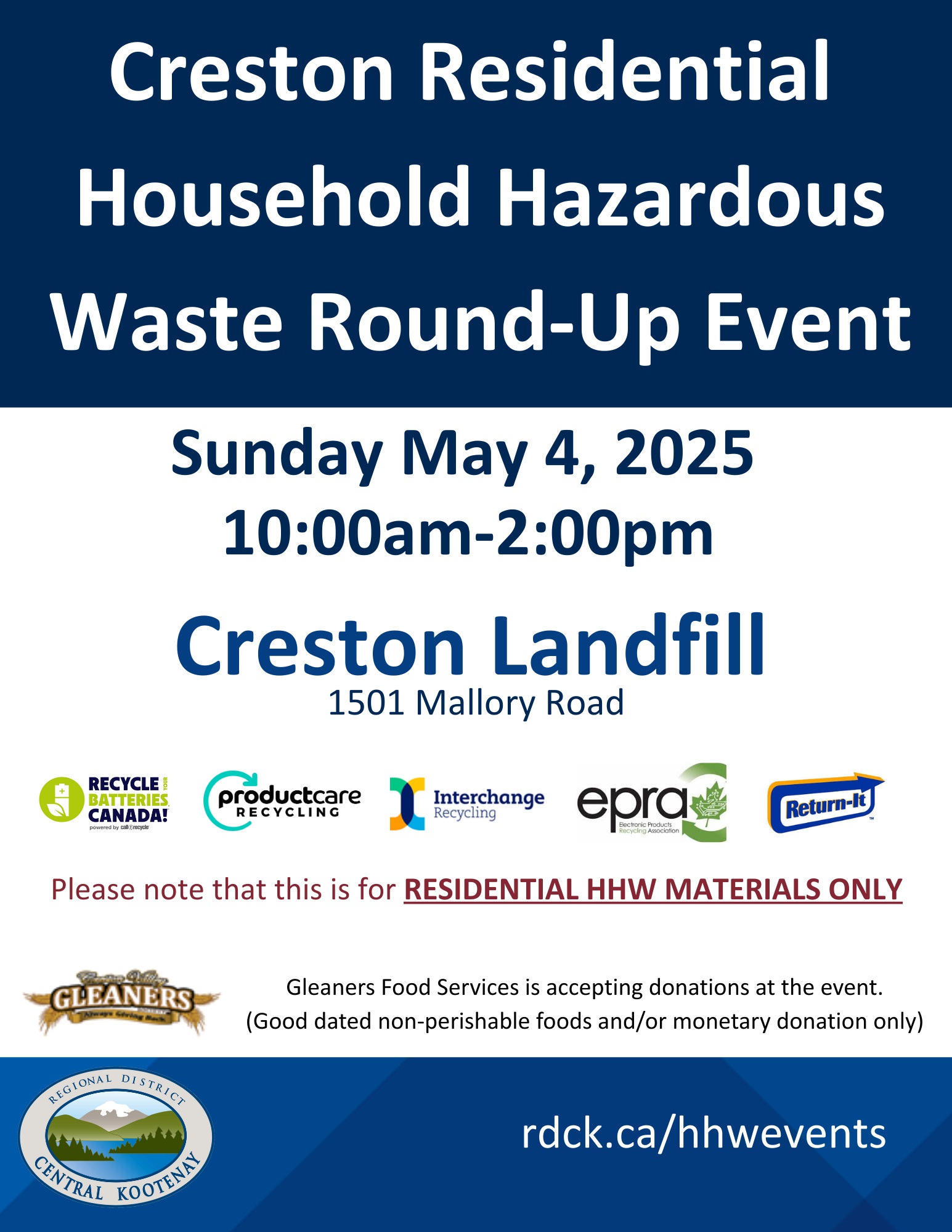 The RDCK is hosting a Spring Household Hazardous Waste Round-Up Event at the Creston Landfill, 1501 Mallory Road on Sunday May 4, 2025 from 10 am to 2 pm.