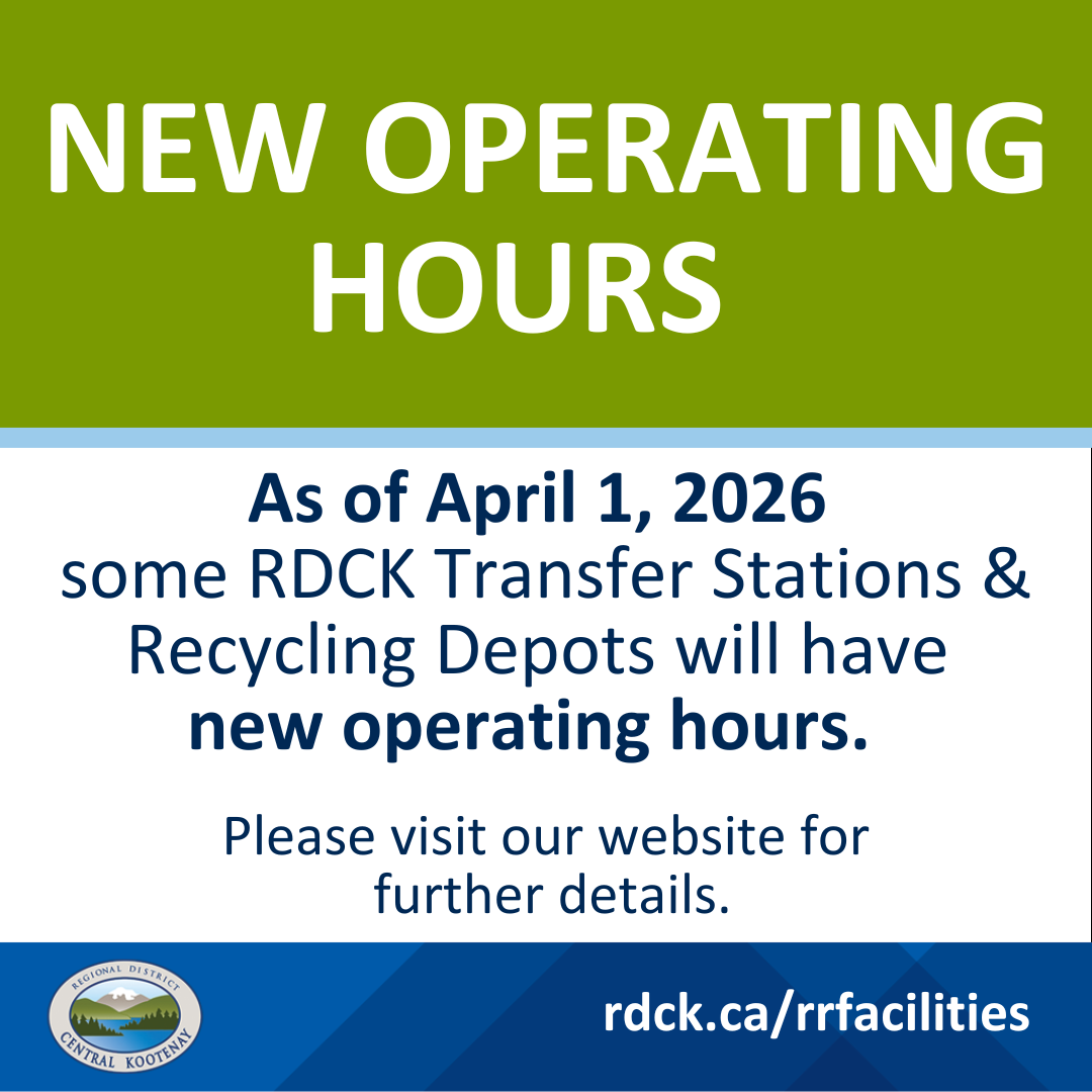 Based on recommendations from an Hours of Operation Review, the Board approved adjustments to operating hours at the Balfour, Boswell, Crawford Bay, Kaslo, Salmo, and Nelson (Lakeside) facilities effective April 1, 2026. The Hours of Operation review looked at site traffic and distance to nearby waste facilities with an aim of improving cost effectiveness and balanced service delivery across the region.