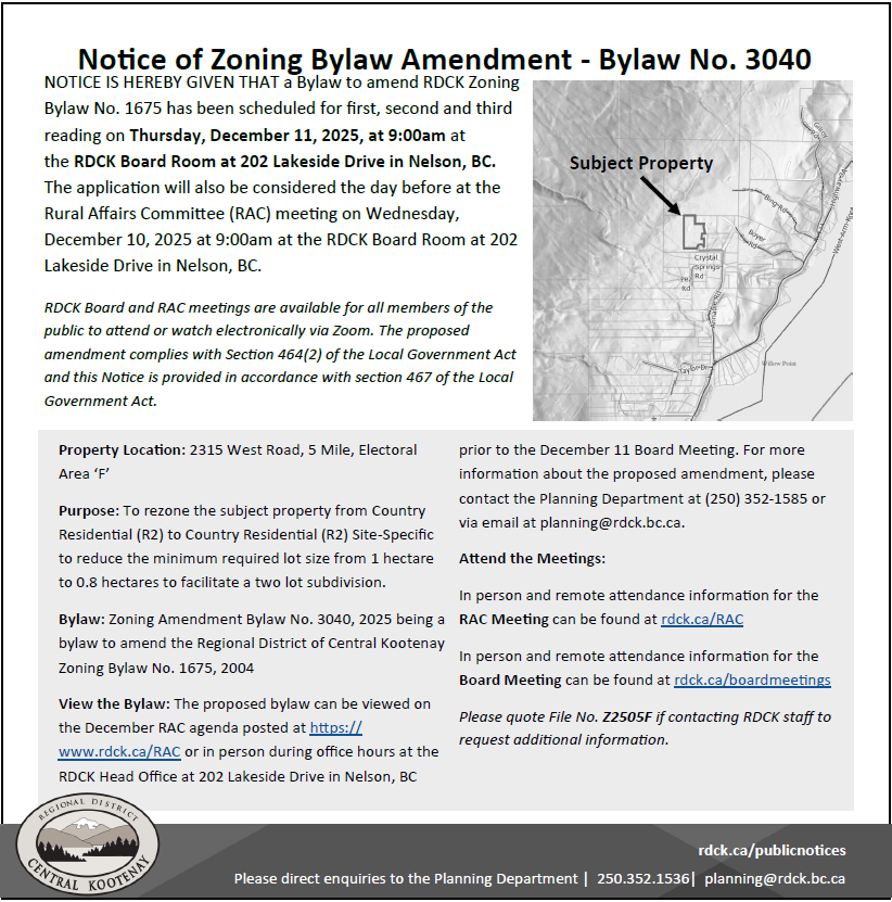 - Posted on the Public Notice Posting Place at RDCK offices.